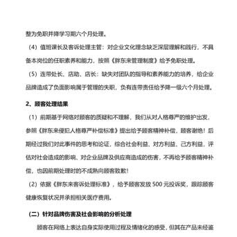 由于对企业文化理念的认知不够,未按照流程标准为顾客处理与解决,给顾客造成伤害且造成社会负面舆论影响,胖东来对实习班长予以免职并降学习期六个月处理,对值班课长以及客诉处理主管也予以免职处理,连带处长、店助、店长负有连带责任给予降一级六个月处理。