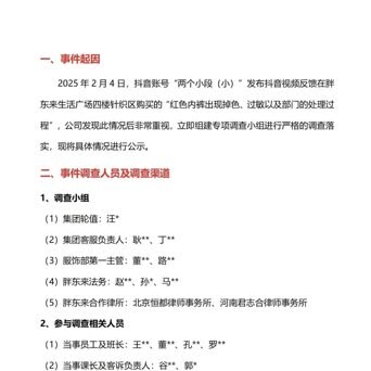 2月14日,胖东来官方抖音号发布长达53页的《关于“红色内裤掉色、过敏以及部门处理过程”的调查报告》。